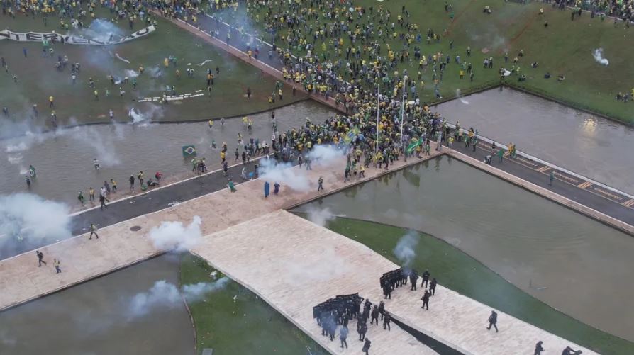 Os vídeos mostram todo o percurso dos extremistas — desde a descida no Eixo Monumental, o confronto com a Polícia Militar, as invasões, até a saída deles da Esplanada dos Ministérios. Nas imagens, policiais militares tentam conter os radicais com uso de spray de pimenta, no entanto, o grupo conseguiu se desencilhar facilmente e invadiu a área de contenção que cercava o Congresso Nacional.