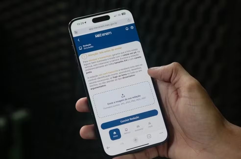 Na área de Redação, o estudante acessa temas baseados em provas anteriores, escreve o texto à mão e tira uma foto. O sistema faz a transcrição automática, permite ajustes e, em seguida, faz a correção com inteligência artificial, que apresenta sugestões e pontuação estimada em até 60 segundos.