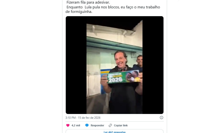 Ao divulgar o vídeo, o ex-ministro escreveu: “Onde ando sempre me pedem adesivos de @flaviobolsonaro”. “Fizeram fila para adesivar. Enquanto Lula pula nos blocos, eu faço o meu trabalho de formiguinha”, afirmou em publicação na rede social X.