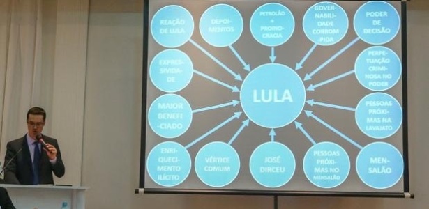 Em entrevista coletiva concedida em setembro de 2016, o então procurador Deltan Dallagnol utilizou uma apresentação em PowerPoint para destacar imagens e gráficos que apontavam Lula como o centro de uma organização criminosa responsável por desvios de recursos públicos na Petrobras.