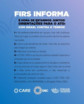 Denominada “Com Israel contra o Terror”, a manifestação ocorreu na Praça Doutor Maurício Cardoso, no bairro Moinhos de Vento. A entidade solicitou que as pessoas comparecessem no ato vestidas de azul e branco.