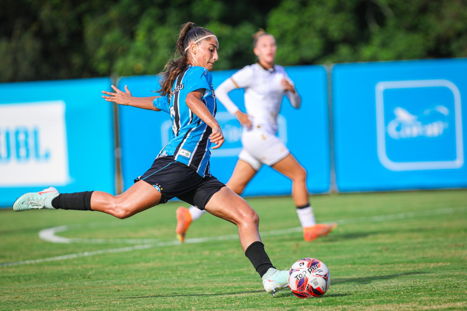 No ataque seguinte, aos oito minutos, a cobrança do escanteio curto teve cruzamento que bateu na marcação e voltou para Natália. Ela pegou com o peito do pé e acertou chute de rara felicidade, encobrindo a arqueira gremista para deixar tudo igual.