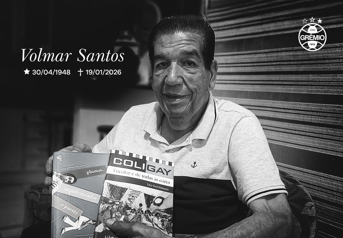 “É com imenso pesar que o Grêmio Foot-Ball Porto Alegrense se despede de Volmar Santos, torcedor fundador da histórica torcida Coligay, também reconhecido como cantor, empreendedor e colunista social.