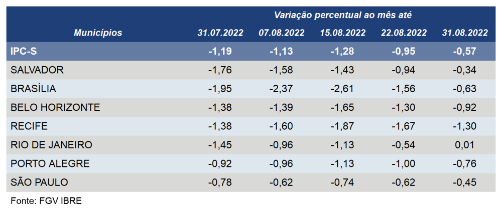 Os dados foram divulgados nesta sexta-feira (02) pela FGV (Fundação Getulio Vargas). Confira abaixo a variação do IPC-S em todas as capitais pesquisadas: