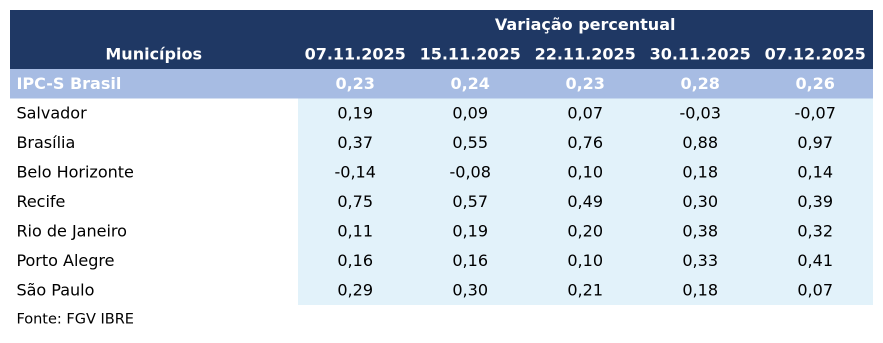Houve desaceleração do IPC-S em São Paulo (0,18% para 0,07%), Rio de Janeiro (0,38% para 0,32%), Belo Horizonte (0,18% para 0,14%) e Salvador (-0,03% para -0,07%).