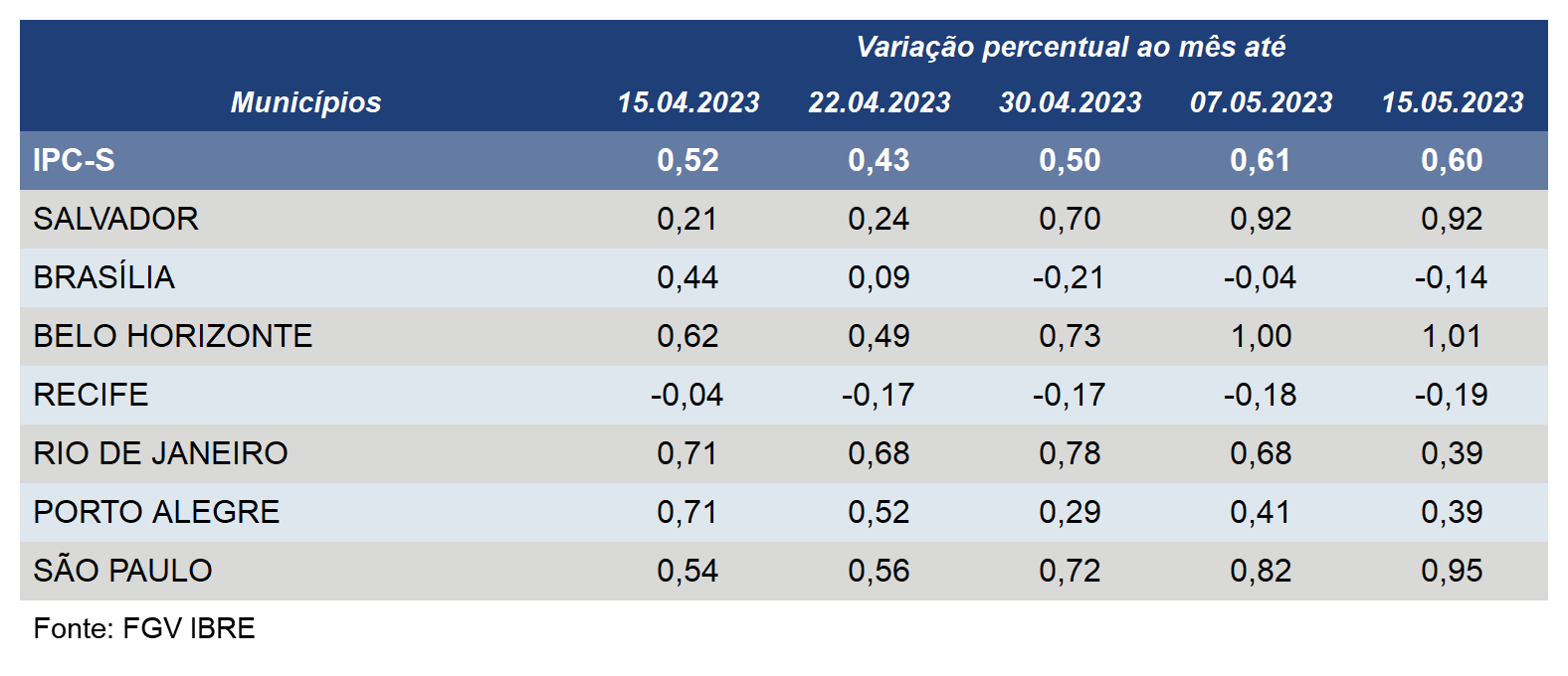 O índice acelerou em Belo Horizonte (1% para 1,01%) e São Paulo (0,82% para 0,95%). Em Salvador, o IPC-S repetiu a variação de 0,92% registrada na primeira semana de maio.