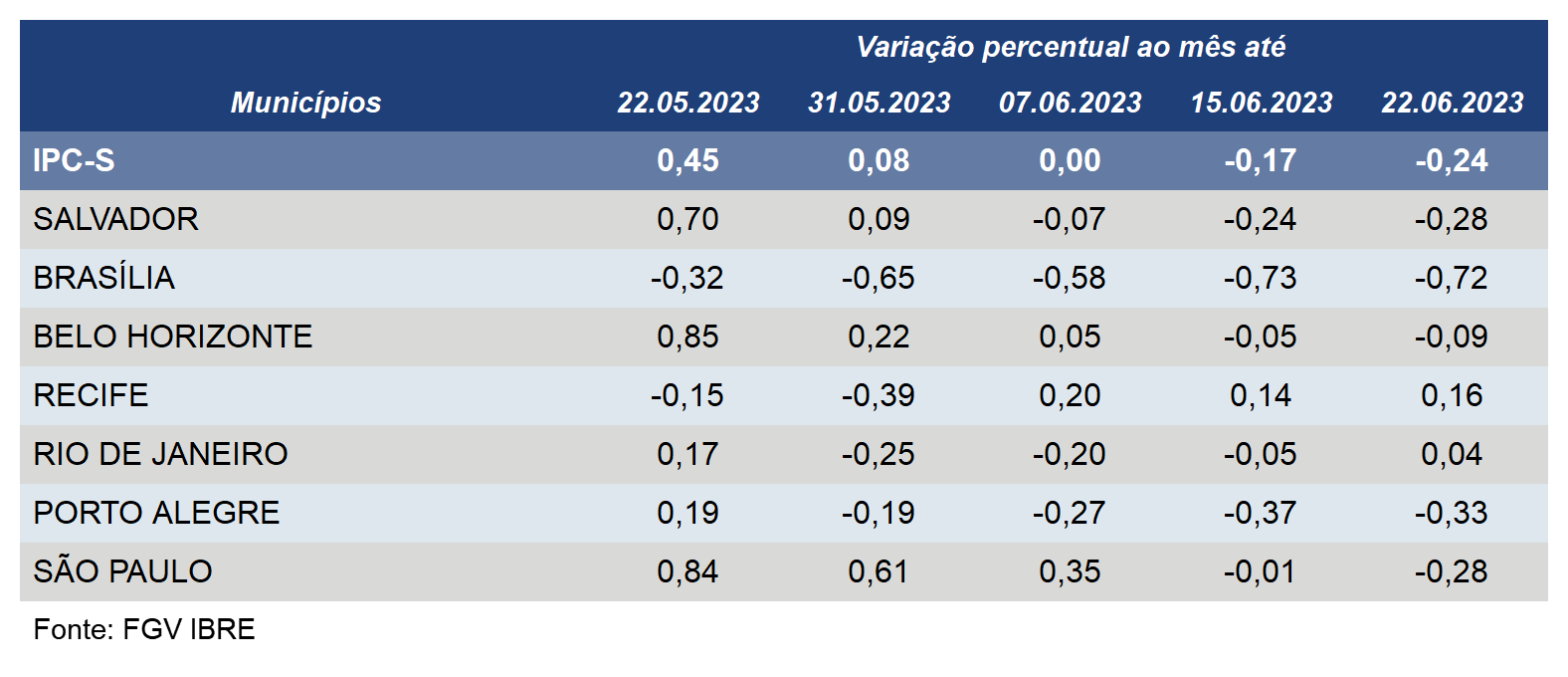 O IPC-S (Índice de Preços ao Consumidor – Semanal) variou -0,33% em Porto Alegre na terceira semana deste mês, interrompendo uma sequência de quedas, segundo dados divulgados pela FGV (Fundação Getulio Vargas).