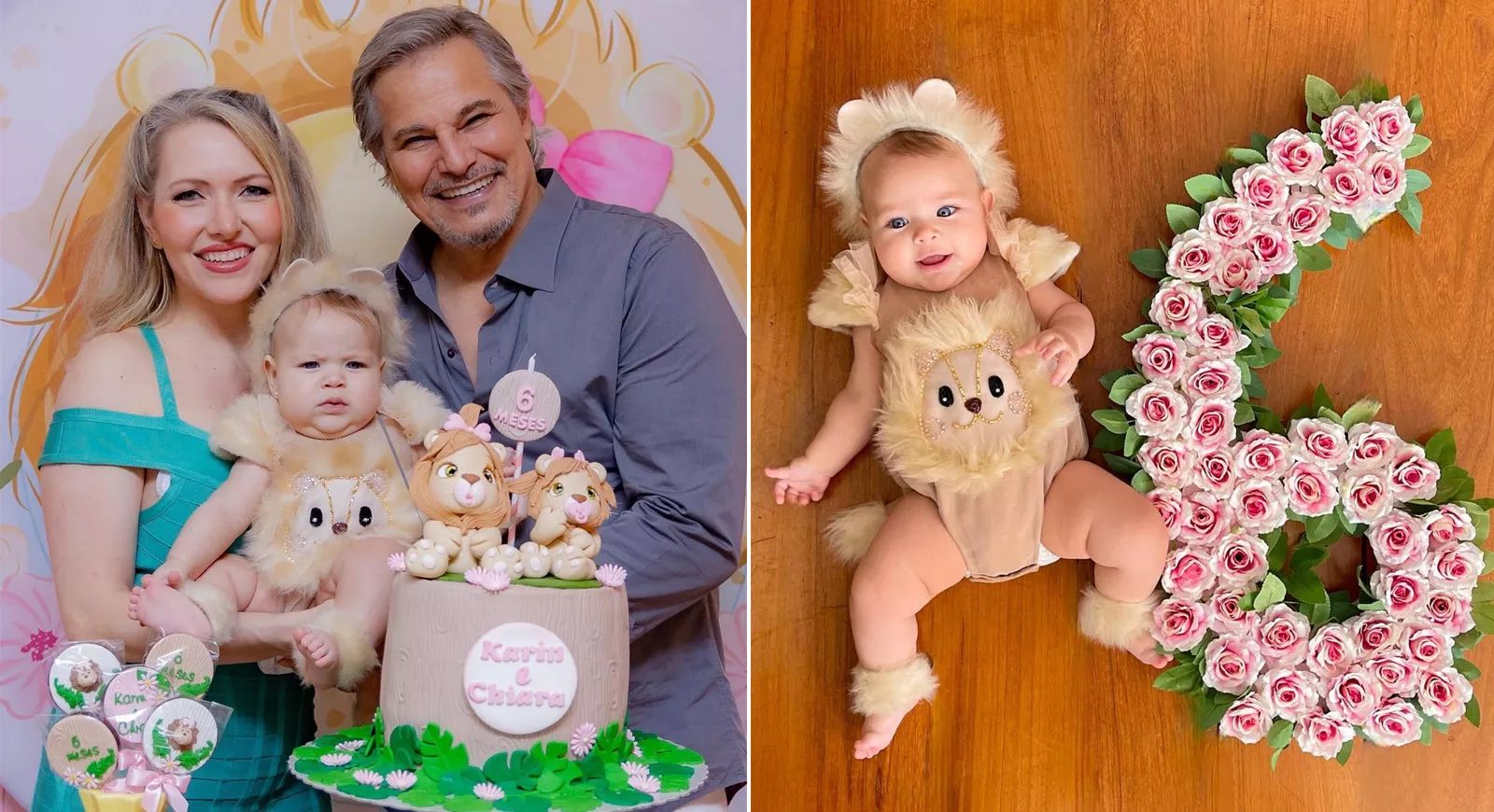 A atriz Karin Roepke comemorou os seis meses de Chiara, sua filha com Edson Celulari, nesta segunda-feira (22). “Roar! Ouviu o rugido dessa leoazinha de 6 meses? Como uma boa leonina, comemorei meu aniversário junto com o mêsversário da Chiara no melhor estilo tal mãe, tal filha leoas!”, escreveu a mãe coruja na legenda das fotos da comemoração postadas no Instagram.