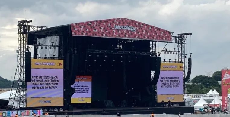 No telão das estruturas, é possível ler um alerta meteorológico: “Por favor, mantenha-se longe das estruturas metálicas do evento.”