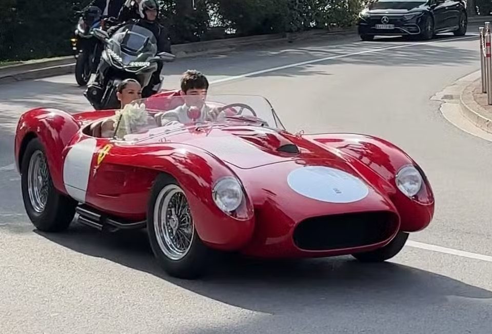 Vestidos com trajes de noivos, eles foram vistos em vídeos que circularam nas redes sociais. Leclerc, de 28 anos, usava terno claro e dirigia o modelo histórico, enquanto Alexandra, de 23, apareceu com vestido branco e buquê de flores claras. O casal foi acompanhado por seguranças durante o trajeto.