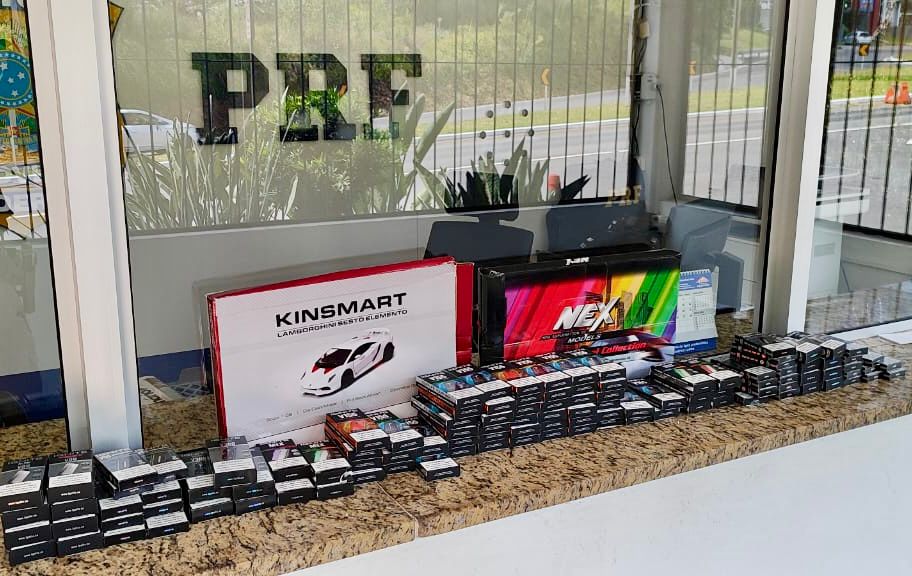 Ao vistoriarem o compartimento de cargas e encomendas do veículo, a equipe localizou duas caixas de brinquedos. Ao abrirem as embalagens, os agentes descobriram que, em vez de brinquedos, as caixas estavam recheadas com 120 cigarros eletrônicos (vapes). A importação e comercialização desse tipo de produto são proibidas no Brasil pela Anvisa, configurando crime de contrabando.