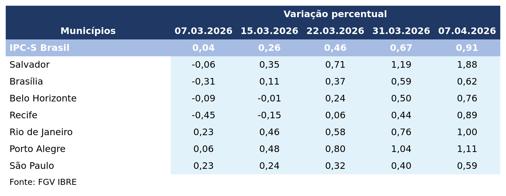 No País, o IPC-S subiu de 0,67% para 0,91%. Com esse resultado, o indicador acumula variação de 3,87% nos últimos 12 meses.