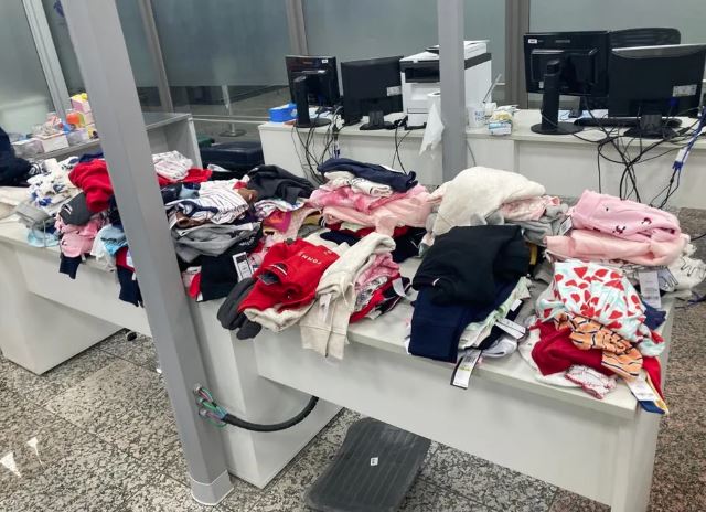 Na ação, a equipe de controle de bagagens da Seção de Vigilância Aduaneira da Receita Federal reteve 158 itens de roupas infantis e 37 itens diversos para crianças, como mamadeiras, bicos, entre outros.