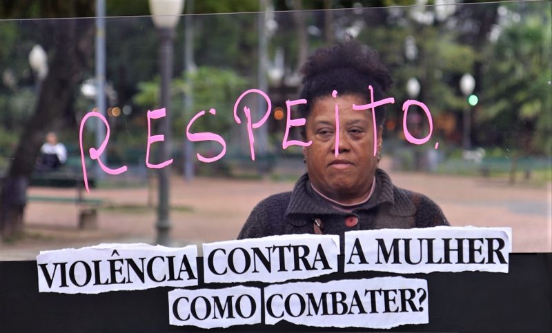 Uma tela de acrílico foi colocada no meio da praça, provocando a curiosidade do público. Na placa, havia um questionamento: “Violência contra a mulher: como combater?”. Pessoas que passavam pelo local foram convidadas a expressar na tela o que pensam sobre o assunto, utilizando palavras-chave.