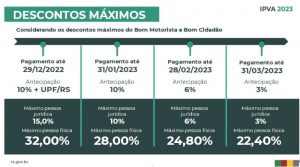 Os descontos para bons motoristas estão mantidos como nos anos anteriores e variam em três faixas conforme o período sem infrações cometidas no trânsito. Para os condutores que não tiveram registro de infrações nos sistemas de informações do Estado no período entre 1º de novembro de 2019 a 31 de outubro de 2022 (três anos), a redução será de 15%. Quem não teve multa depois de 1º de novembro de 2020 (dois anos) recebe desconto de 10% e, depois de 1º de novembro de 2021 (um ano), tem direito a benefício de 5%.