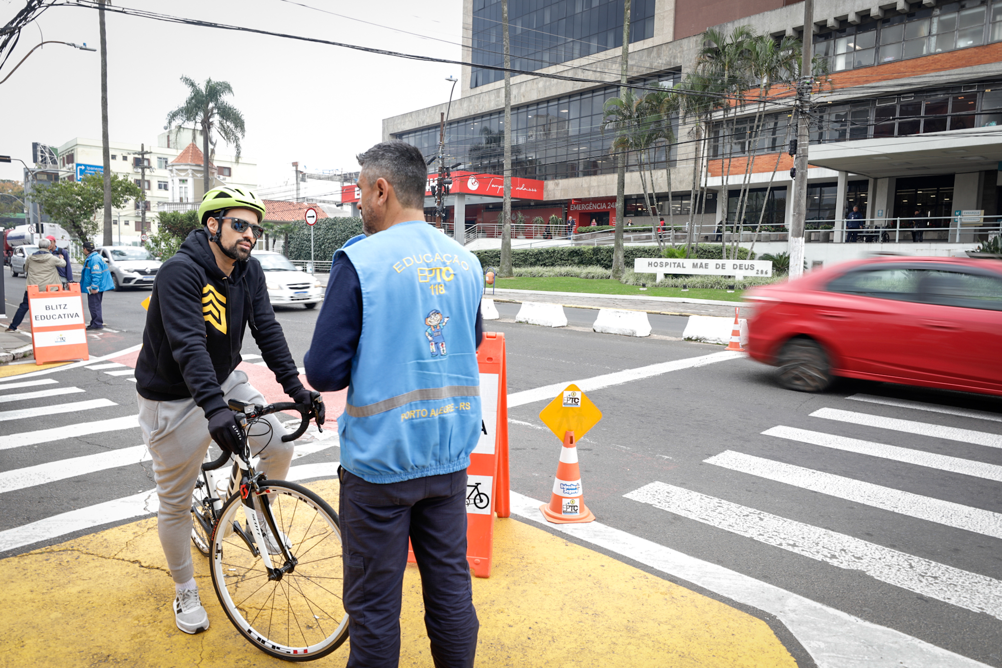 Alertar ciclistas sobre a importância da percepção dos riscos e do autocuidado no trânsito e orientar motoristas sobre o embarque e desembarque de passageiros junto à ciclovia foram os principais assuntos abordados em mais uma Operação Blitz Bike, realizada na avenida José de Alencar pelos agentes de trânsito da Escola Pública de Mobilidade. Na manhã desta quarta-feira, 21, a Secretaria de Mobilidade Urbana realizou, por meio da Empresa Pública de Transporte e Circulação (EPTC), a tradicional ação educativa para ciclistas, junto ao Hospital Mãe de Deus, no bairro Menino Deus.