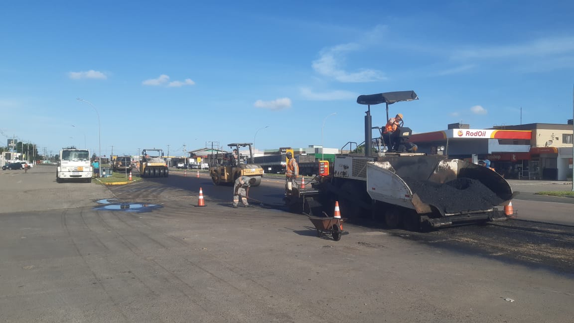 As obras e intervenções na pista, com trabalhadores e máquinas, podem causar bloqueios de faixas, lentidão e retenção sinalizada de veículos.