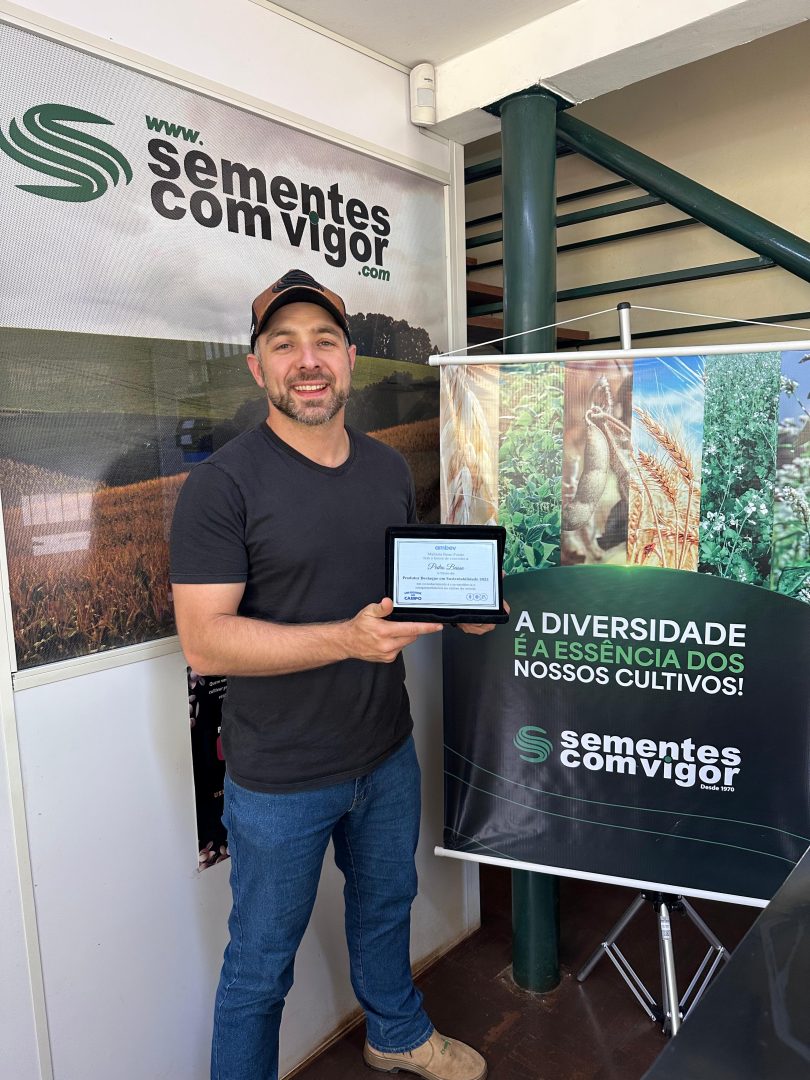 O diretor da Sementes Com Vigor (SCV), Pedro Basso, recebeu o prêmio Produtor Destaque em Sustentabilidade 2025, uma distinção concedida pela Maltaria Passo Fundo e pela Ambev. O prêmio é um reconhecimento ao trabalho na produção de cevada, onde a empresa colheu uma média de 100 sacas por hectare em 165 hectares. “Ano bom, com sistema bom”, afirmou Basso, explicando a relevância do manejo sustentável da agricultura regenerativa e do seu impacto positivo nos resultados nas fazendas da SCV.