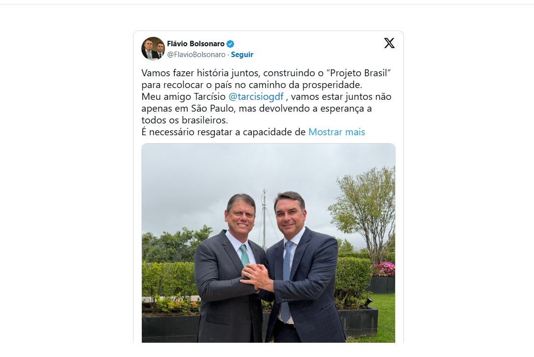 “Vamos fazer história juntos, construindo o ‘Projeto Brasil’ para recolocar o País no caminho da prosperidade. Meu amigo Tarcísio, vamos estar juntos não apenas em São Paulo, mas devolvendo a esperança a todos os brasileiros”, escreveu Flávio nas redes sociais. Na imagem, os dois aparecem lado a lado, com um aperto de mãos.