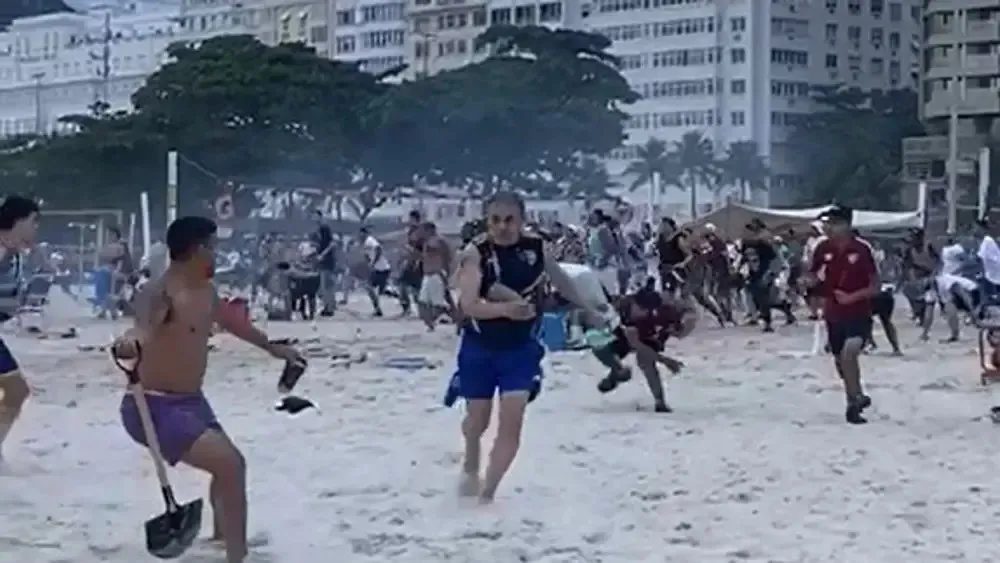 Imagens que circulam no Twitter mostram uma briga generalizada e “guerra” de cadeiras e sombrinhas de praia. Pessoas que curtiam o feriado de Finados no local precisaram correr para não serem atingidos por objetos atirados pelos torcedores.