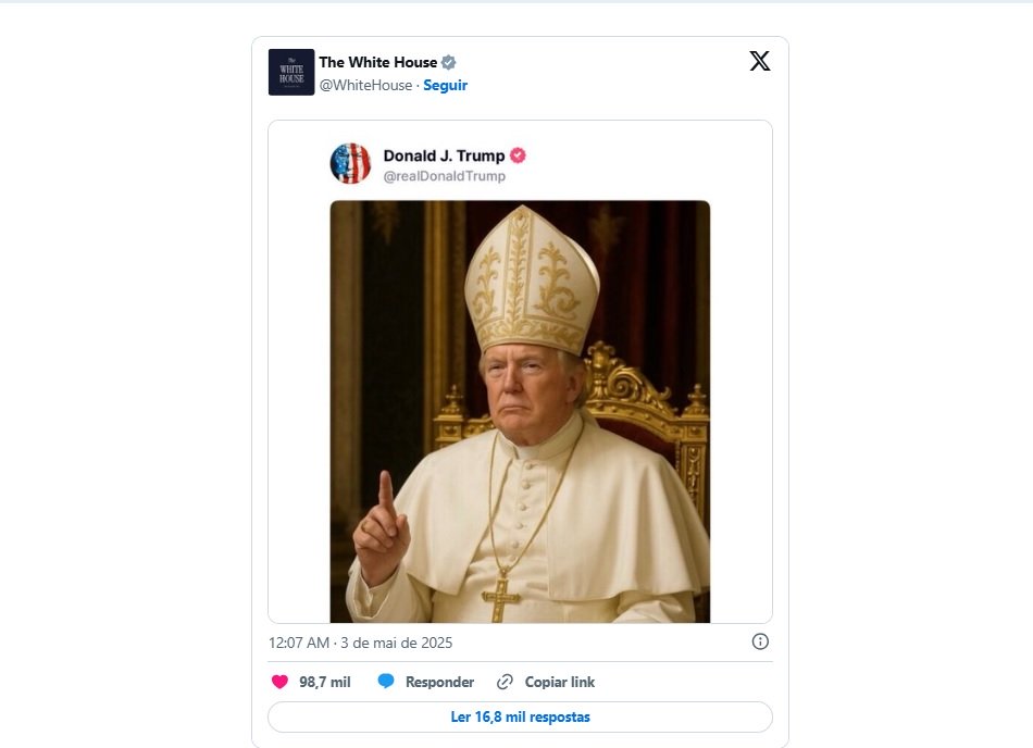O presidente dos Estados Unidos e o perfil oficial da Casa Branca no X (antigo Twitter) publicaram na sexta-feira (2), nas redes sociais, uma imagem em que Donald Trump aparece vestido como papa, sentado em uma cadeira de estrutura dourada.
