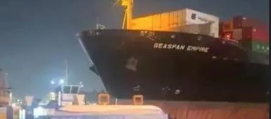 Navio atinge balsas no Porto de Santos e tripulantes pulam no mar