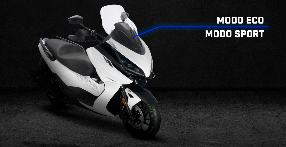 Um dos grandes diferenciais da Zontes 350E é o sistema de modos de condução. O piloto pode alternar entre o modo Eco, voltado para economia de combustível e viagens mais longas, e o modo Sport, que proporciona uma resposta mais rápida e dinâmica, ideal para o uso urbano. O sistema é inteligente: ao ultrapassar 7.000 rpm, a scooter muda automaticamente para o modo esportivo, garantindo desempenho imediato em situações de ultrapassagem ou emergência.